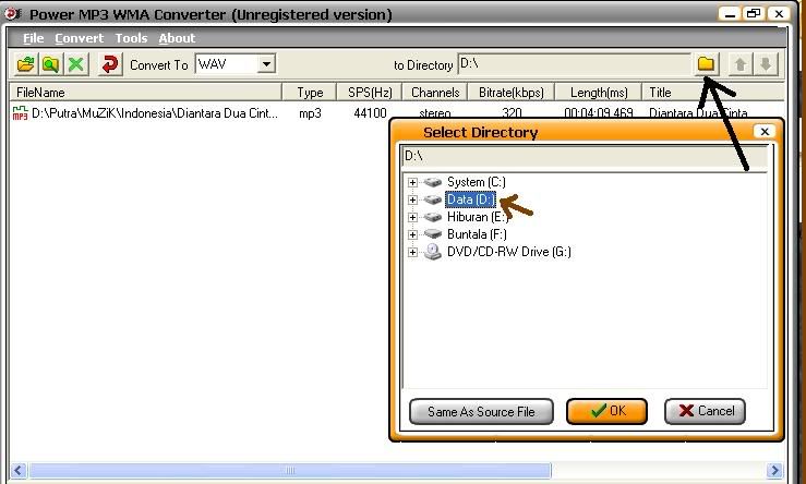 04.Setelah anda menggantinya,klik lagi gambar folder yang ada di sudut kanan atas (Browse Directory for Converting) atau klik F4 pada key board.Setelah anda pilih akan muncul kotak ,itu adalah tempat di mana lagu anda akan tersimpan, contoh anda memilih lagu anda tersimpan di DATA (D:). Lihat gambar di bawah ini :