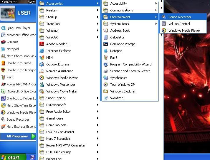 Caranya klik lagi Start Baru pilih All Program lalu pilih lagi Accessories baru pilih lagi Entertainment dan yang terakhir pilih Sound Recorder.Lihat gambar berikut: