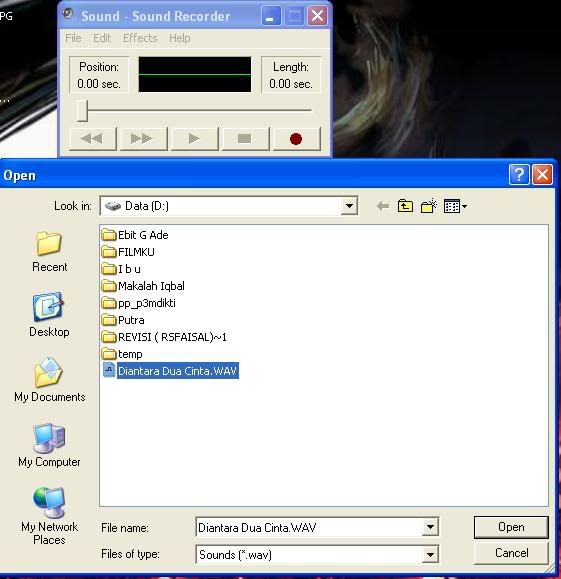 Caranya klik file lalu pilih open.Setelah muncul kotak, carilah lagu yang telah anda simpan di DATA (D:) dengan format WAV.Kemudian klik Open.LIhatlah contoh di bawah ini :