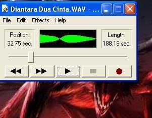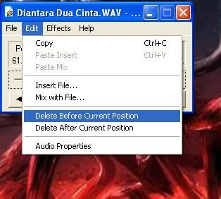 08.Setelah itu,kliklah gambar play dan lagu itu akan terputar. Jika kamu membutuhkan hanya reffnya saja untuk membuat nada dering di hp anda,maka sebelum reff anda harus memberhentikan lagu tersebut dengan memilih gambar stop.Setelah lagu tersebut berhenti klik Edit lalu pilih Delete Before Current Position,lalu klik OK. Lihat gambar di bawah ini :