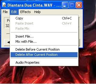 09.Setelah anda memotongnya,putar lagi lagu tersebut dan hentikan lagi setelah reff selesai.lalu klik lagi Edit dan pilih Delete After Current Position,lalu klik OK. . Lihat gambar di bawah ini :