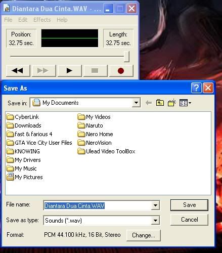 10.Maka lagu anda sudah terpotong menjadi Reffnya saja.Setelah itu klik File lalu pilih Save AS,kemudian carilah tempat dimana potongan lagu anda mau disimpan.Contoh anda menyimpannya di My Document.Sesudah pilih Save.Lihat gambar di bawah ini: